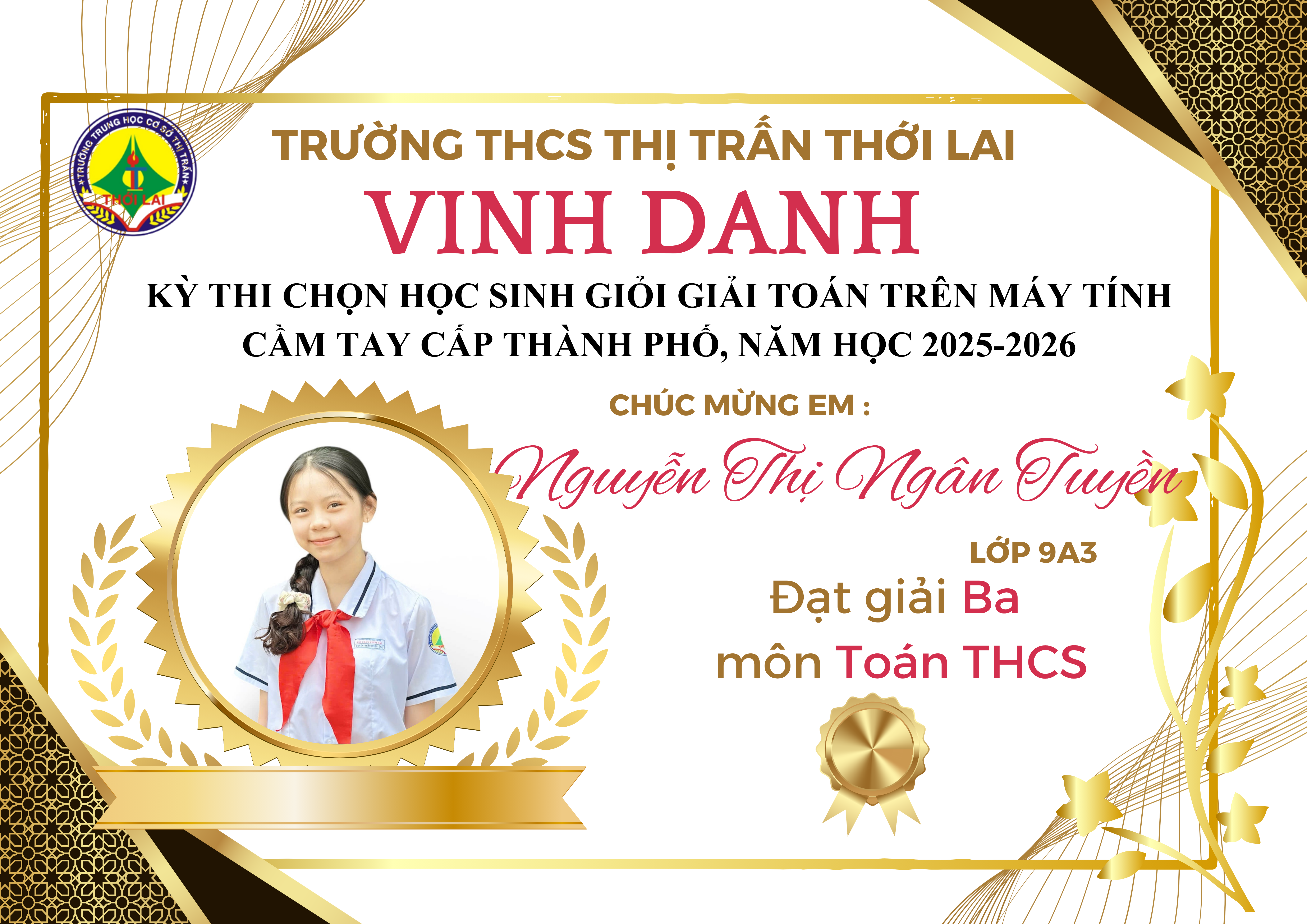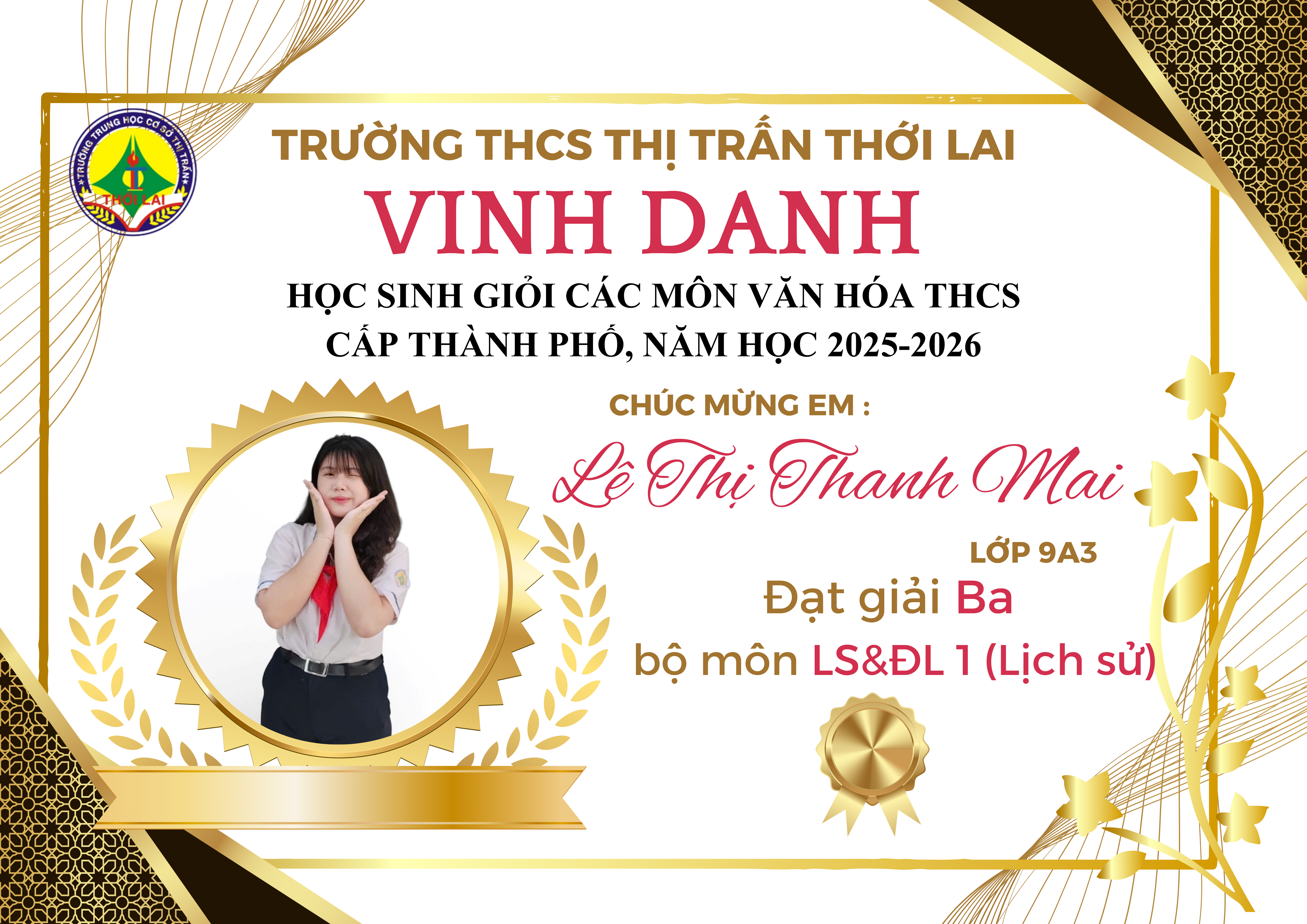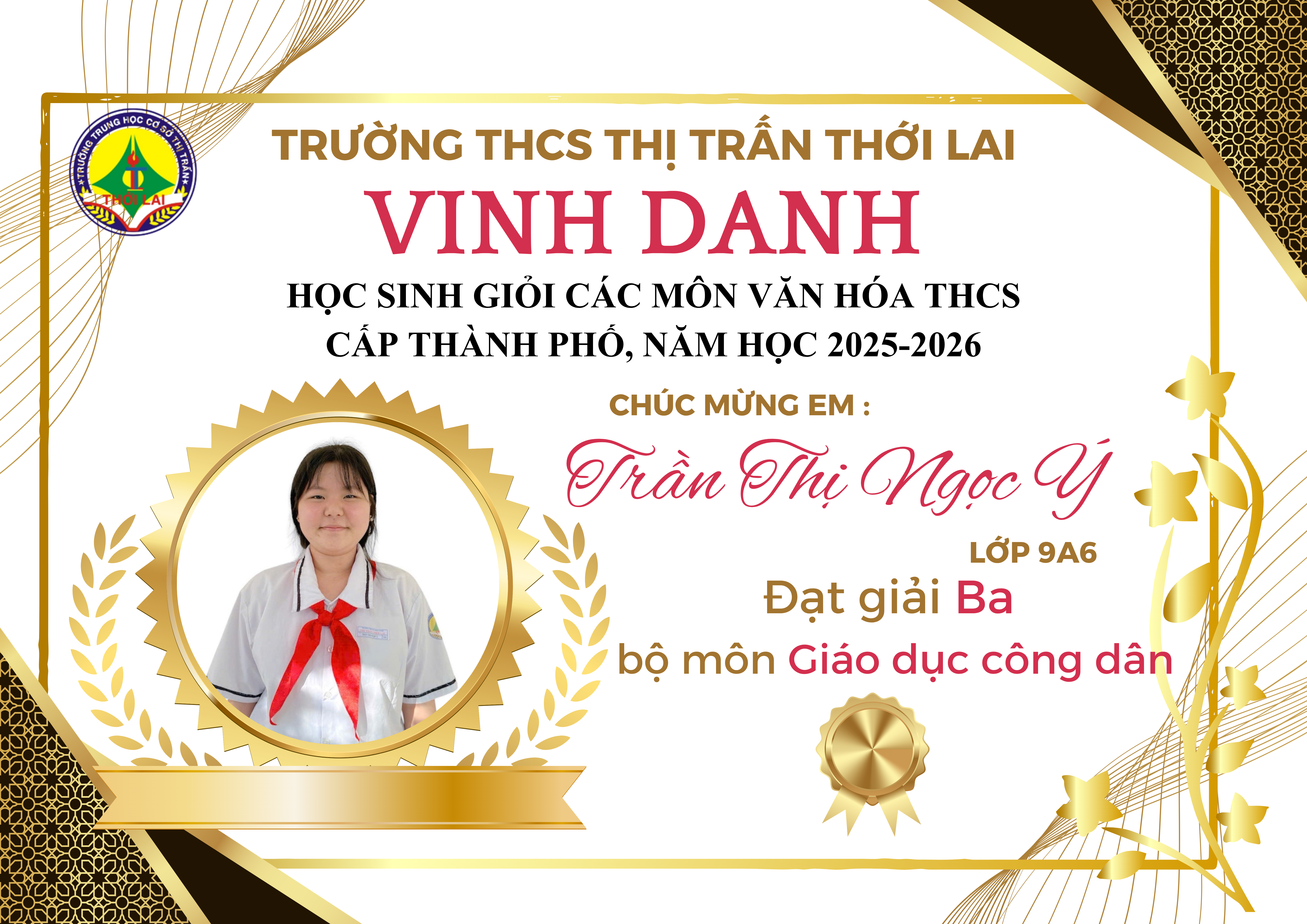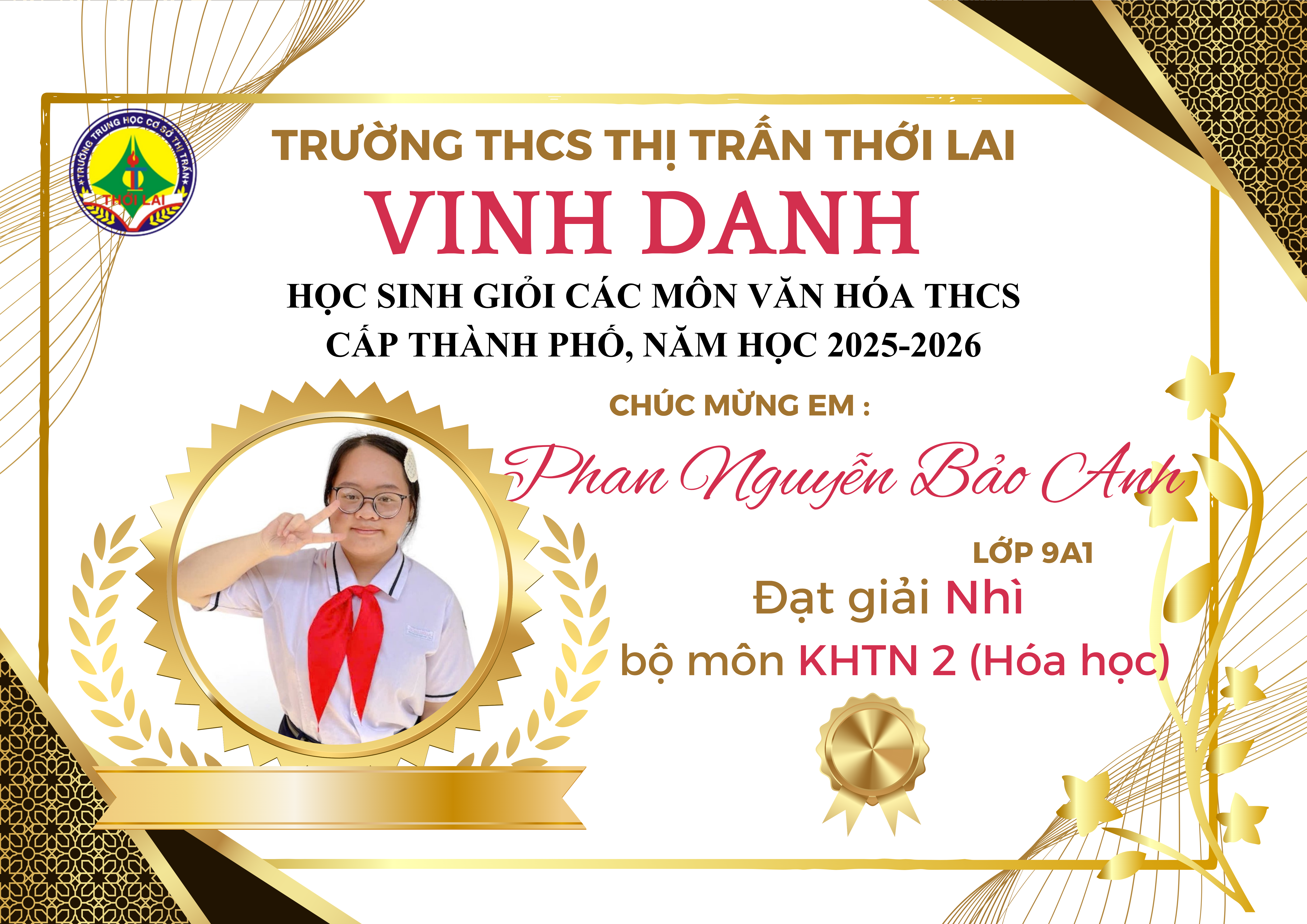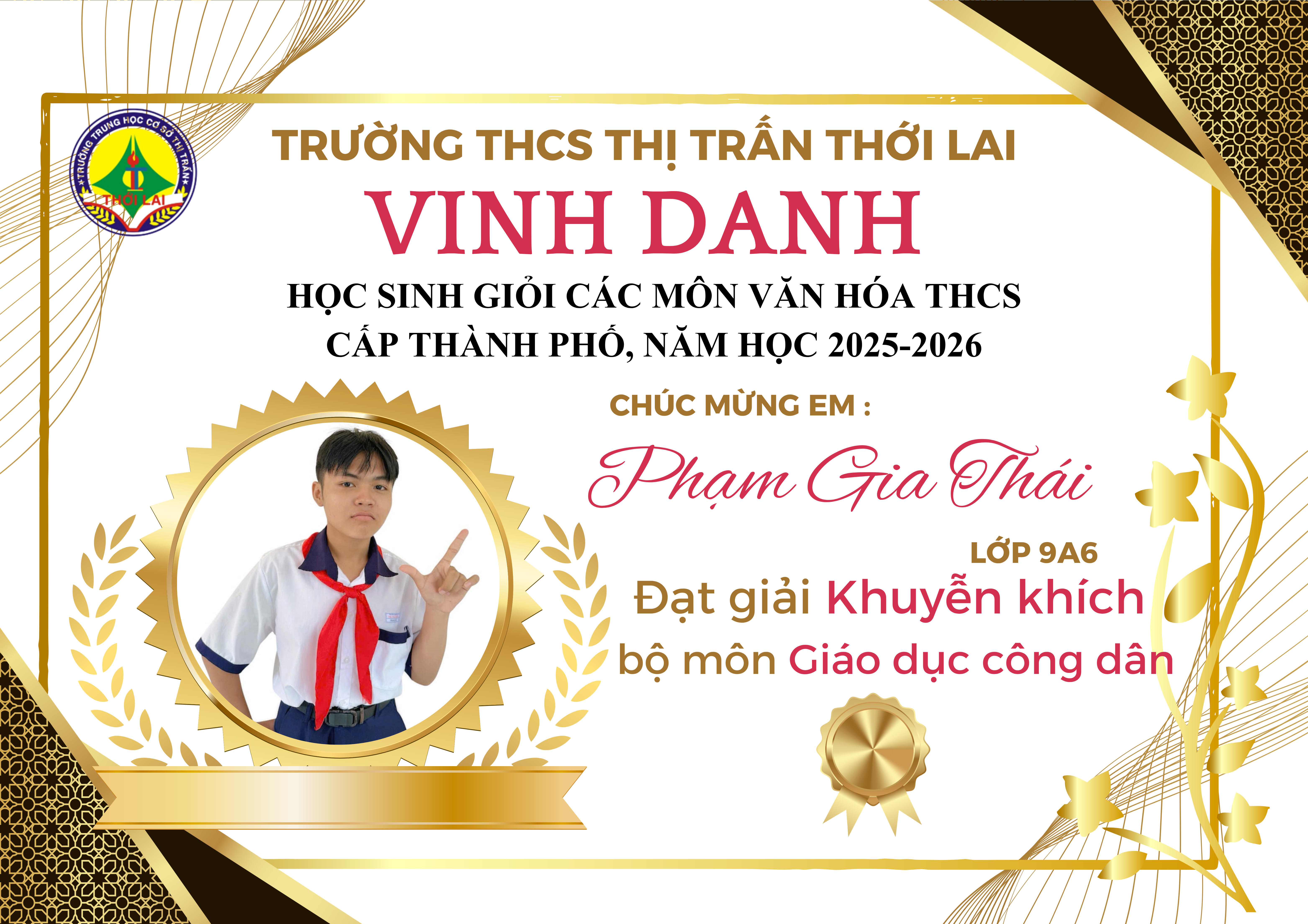Khi kỳ thi học sinh giỏi các môn văn hóa và học sinh giỏi giải toán trên máy tính cầm tay cấp Thành phố vừa khép lại, cũng là lúc những nỗ lực bền bỉ và tinh thần học tập nghiêm túc của các em học sinh Trường THCS Thị trấn Thới Lai được ghi nhận một cách xứng đáng. Trong không khí hăng say của năm học vẫn đang tiếp diễn, nhà trường tự hào vinh danh những gương mặt tiêu biểu đã xuất sắc đạt danh hiệu Học sinh giỏi các môn văn hóa năm học 2025 – 2026.