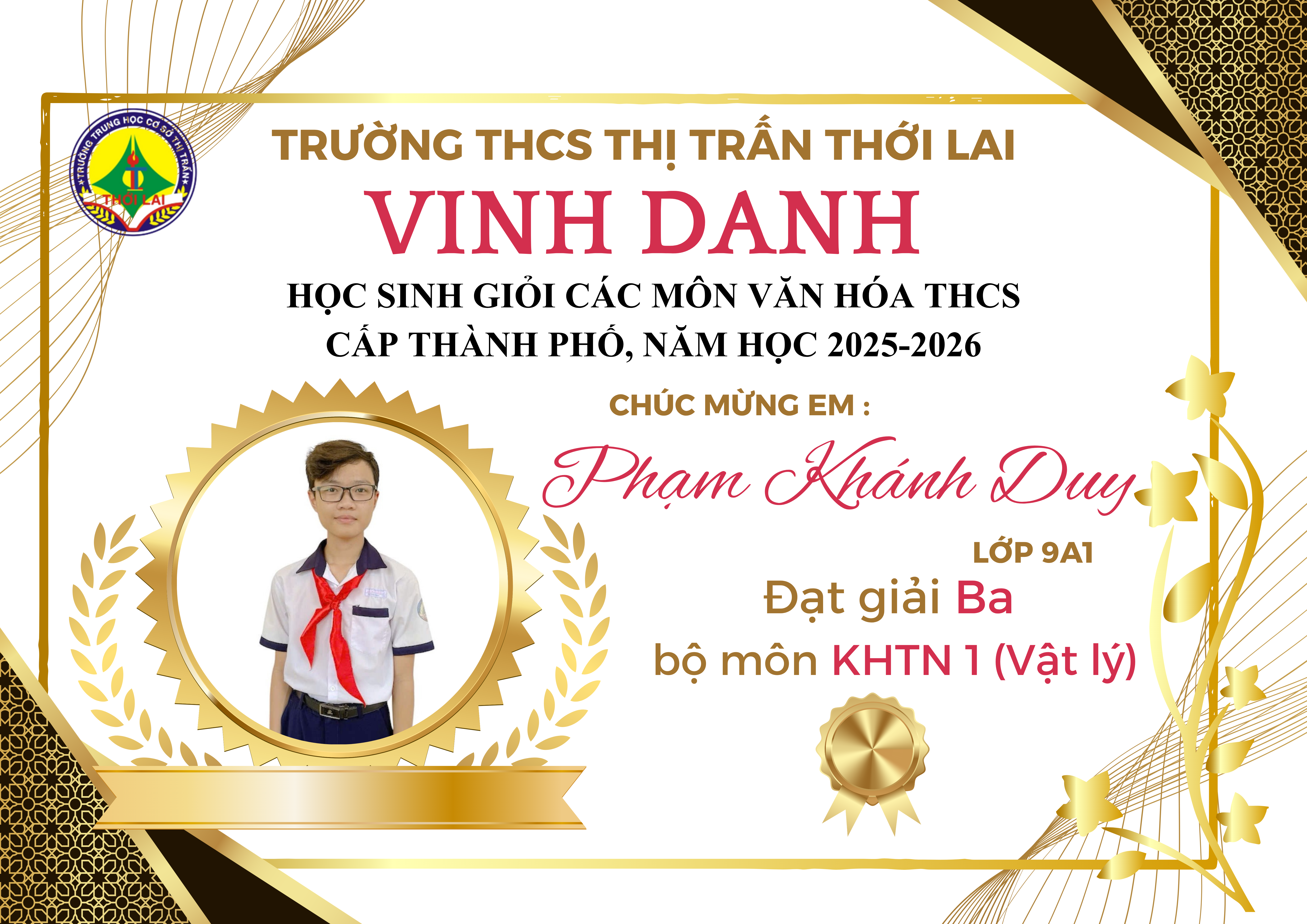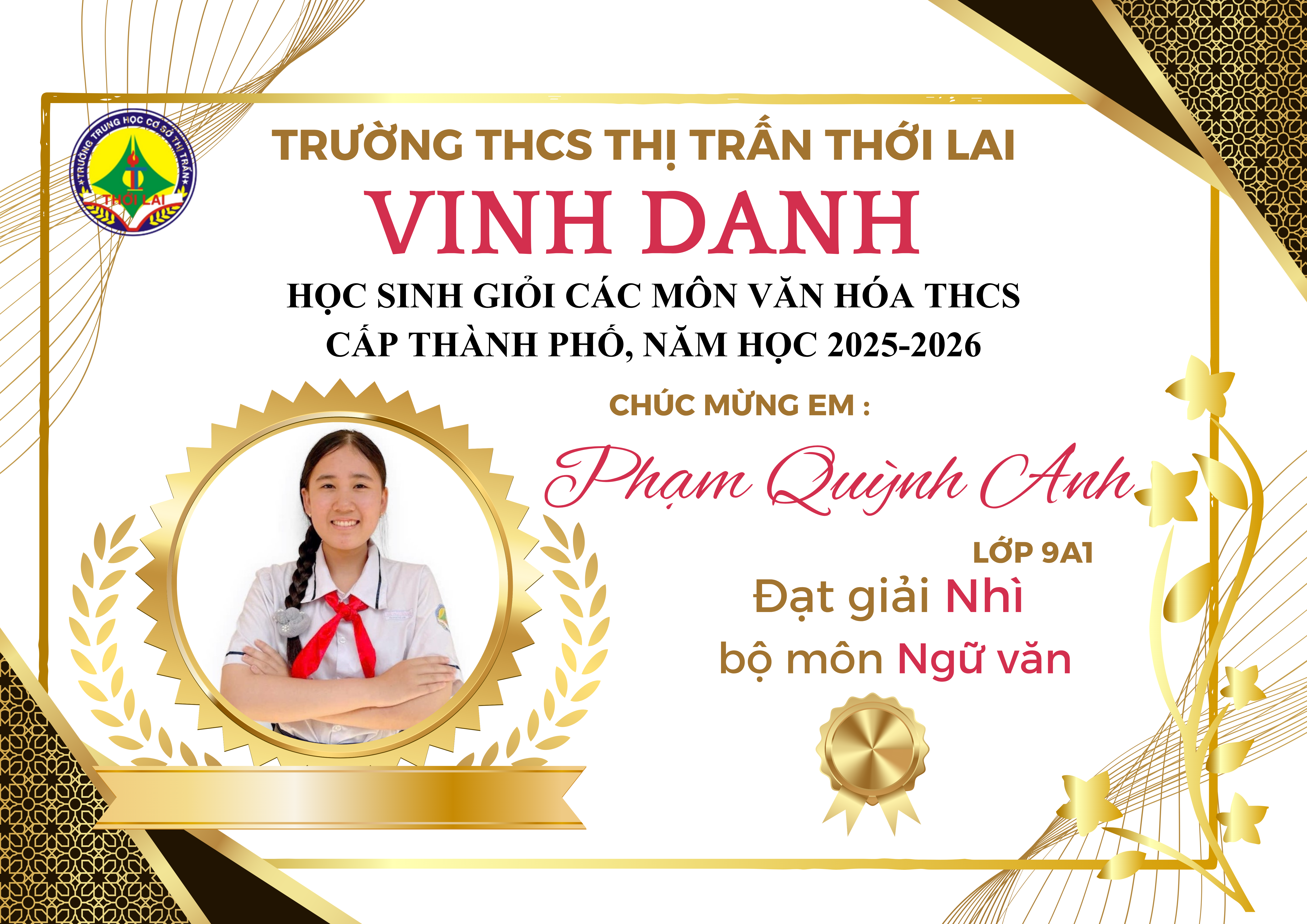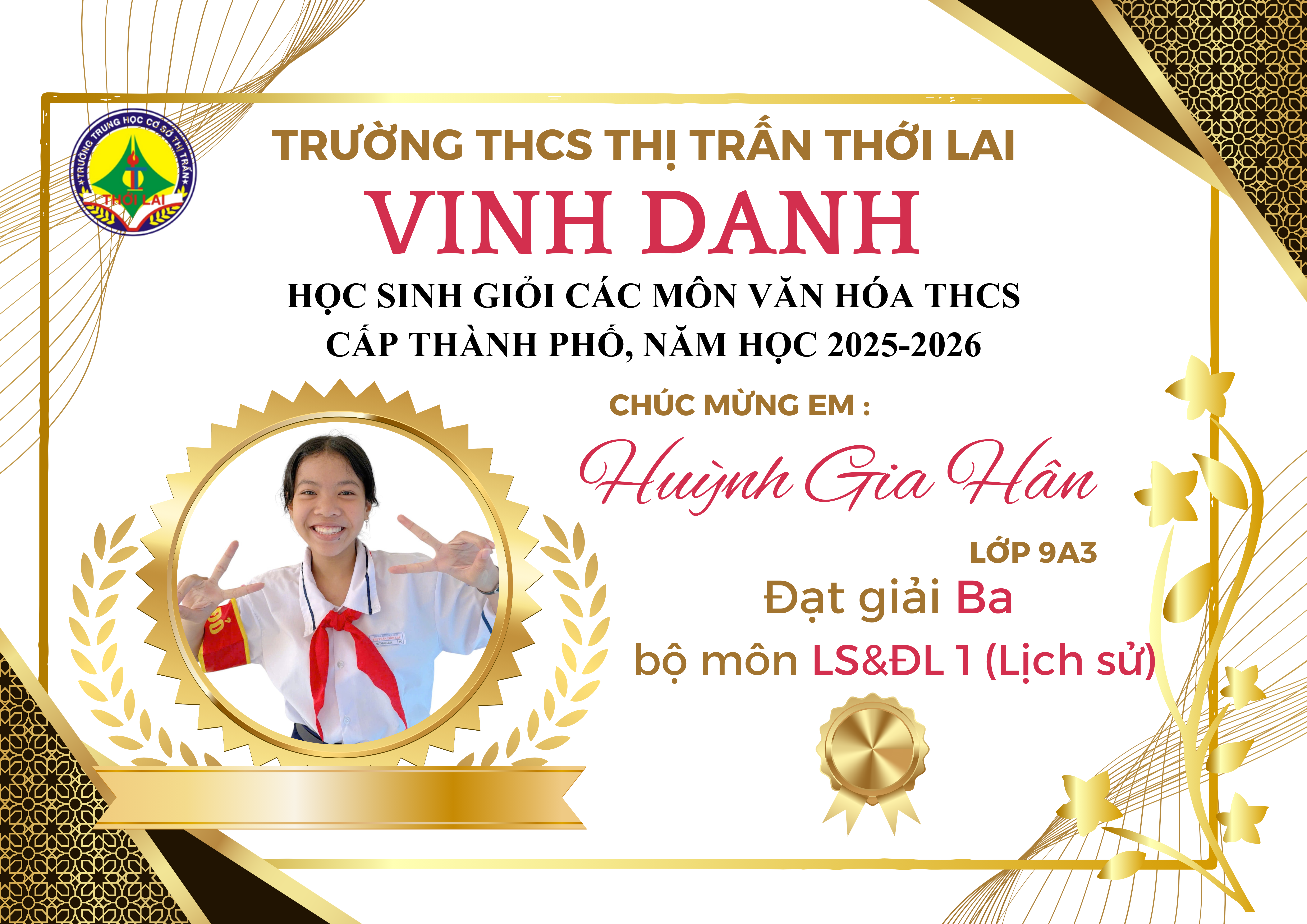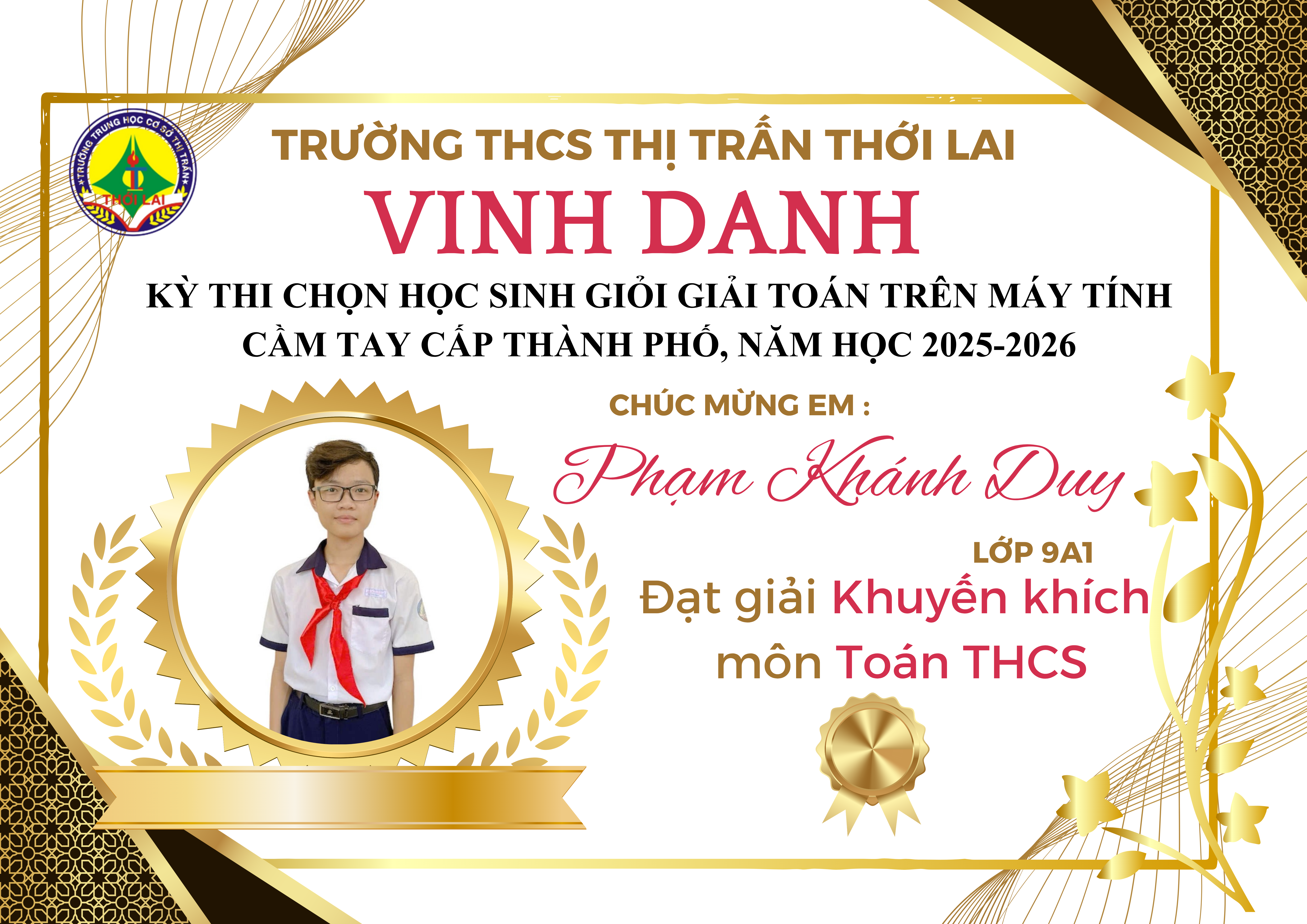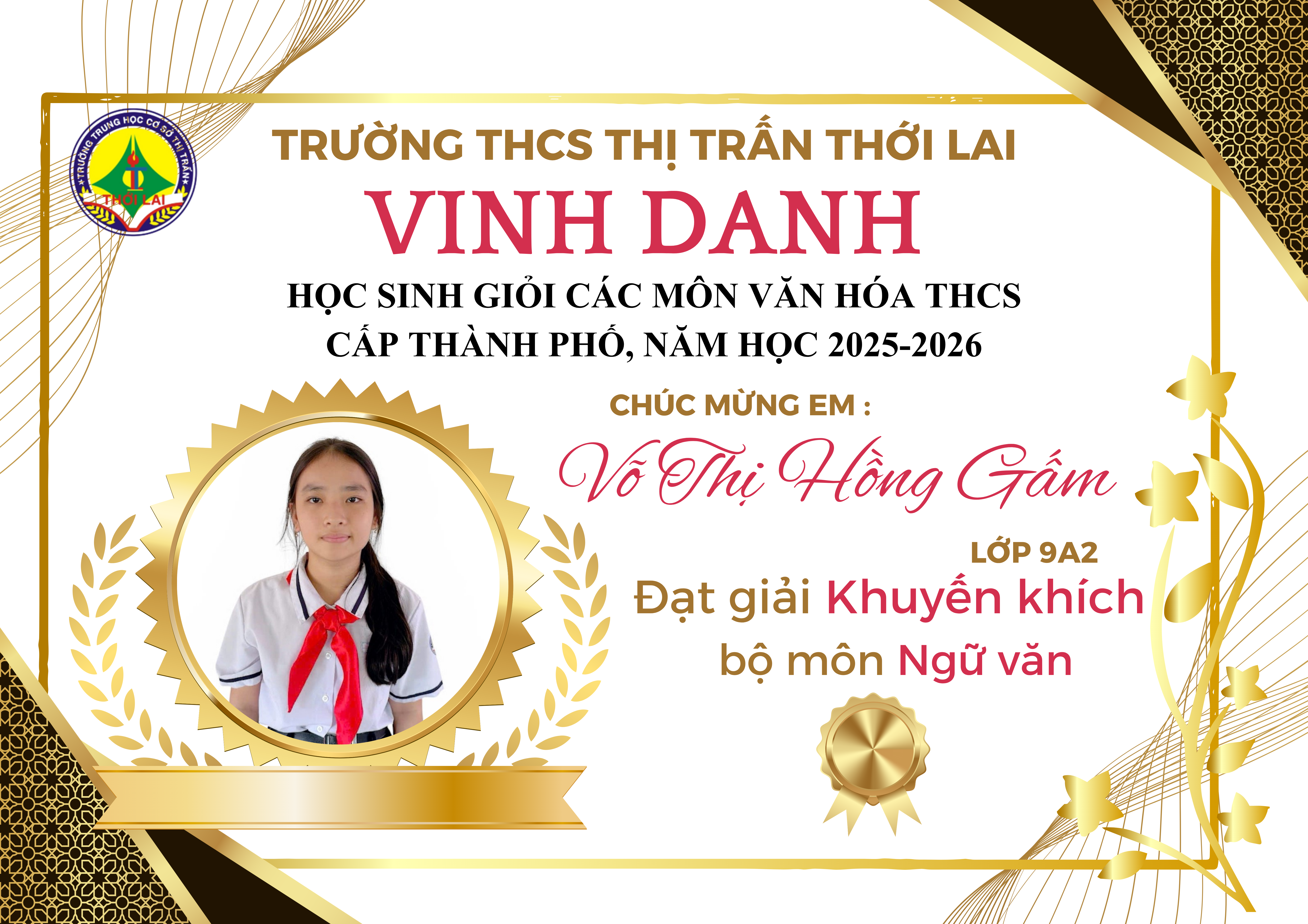 Khi kỳ thi học sinh giỏi các môn văn hóa và học sinh giỏi giải toán trên máy tính cầm tay cấp Thành phố vừa khép lại, cũng là lúc những nỗ lực bền bỉ và tinh thần học tập nghiêm túc của các em học sinh Trường THCS Thị trấn Thới Lai được ghi nhận một cách xứng đáng. Trong không khí hăng say của năm học vẫn đang tiếp diễn, nhà trường tự hào vinh danh những gương mặt tiêu biểu đã xuất sắc đạt danh hiệu Học sinh giỏi các môn văn hóa năm học 2025 – 2026.